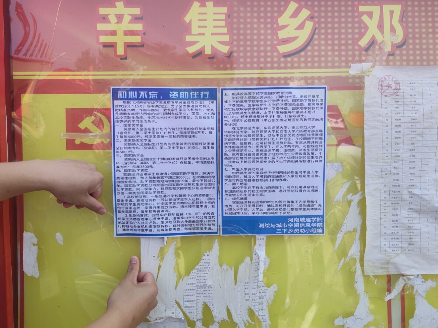 到到目的地之后,团队根据事先计划好的内容开始了本次宣传活动,在基本了解村里面的情况之后,跟村里面书记做好沟通,在其大力支持下,团队成员对国家资助政策全方位、立体化、多层次地对国家资助美德进行政策解读。让老百姓了解现在社会在普通高校建立了以国家奖助学金、国家助学贷款、学费补偿贷款代偿、勤工助学、校内奖助学金、困难补助、伙食补贴、学费减免等多种方式并举的资助政策体系,同时实施“家庭经济困难新生入学绿色通道”,捐资助学的善举。
