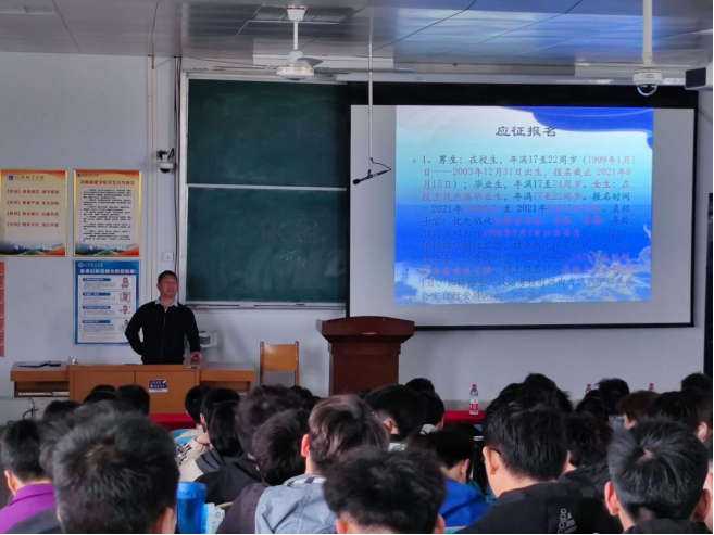 (通讯员:许东辉 王梦雨)为响应国家征兵政策,确保征兵工作高质量、高标准完成,公司加大征兵宣传力度,召开专场征兵工作会议。4月13日下午,伟德国际bevictor1949在五号楼316阶梯教室开展2021年春季老员工征兵宣传活动。公司各年级员工代表和有参军意愿的员工参加本次宣讲。校保卫处副部长褚清营、国防教育科王艳杰老师、公司党委副书记卫柳艳、团学办以及辅导员参加宣讲。