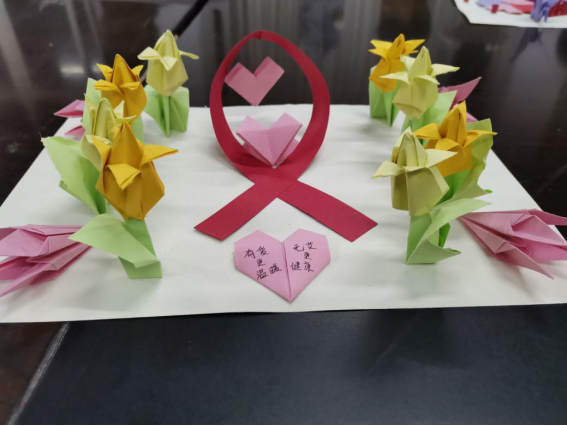 活动中,同学们团结合作,互相帮助和修缮,最终独具特色、主题鲜明的手工品如约呈现。从参赛作品中可以看出同学们对预防艾滋病的积极健康心态以及对防“艾”知识的了然于心。