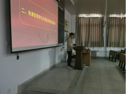 在主持人宣布报告会开始后,首先由优秀员工代表张海雪上台分享他的大学四年生活,并向同学们推荐了可以提高自己技能的软件、公众号和文库。他还向同学们表明大学里学习的重要性,但也不是唯一的任务,倡导同学们在学习的同时也要注意体育锻炼,多方面发展。