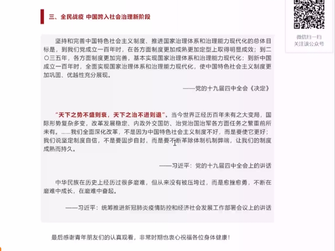 (通讯员 李方圆 刘雯雯 贾思洁)为深入贯彻落实公司防疫工作要求,充分展示中国共产党领导的中国特色社会主义制度的优越性,激励全院广大团员青年更加紧密地团结在以习近平同志为核心的党中央周围,进一步坚定制度自信,公司于2020年5月4日下午8点通过QQ群,线上屏幕分享,开展了“绽放战疫青春,坚定制度自信”主题班会。