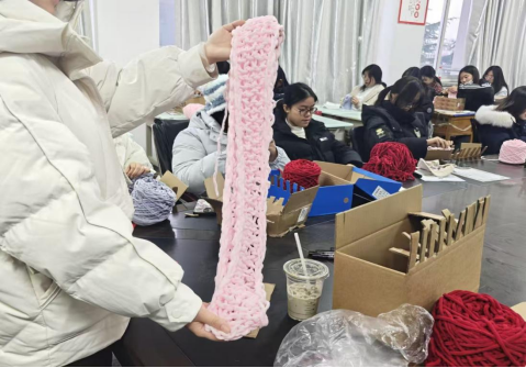 活动前期,志愿者们收集废旧纸盒,动手改造成简易编织架、绕线器;活动当天,志愿者们围聚在活动室:有人用纸盒架固定绒线,有人跟着教程练习编织,废旧纸盒在指尖变成实用工具,原本松散的毛线渐渐织成纹理整齐的围巾。过程中,不仅将废物利用,还在自己动手中体会到了付出的快乐。
