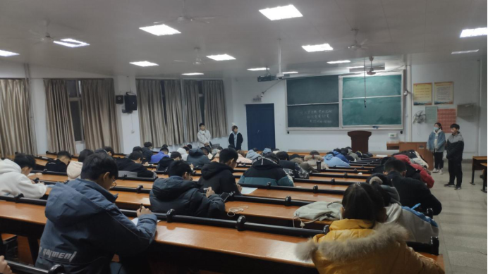 晚上6点,竞赛正式开始,同学们在监考人员的带领下有序落座。在监考人员分发完试卷后,同学们开始了答题。答题过程中,全场保持安静,同学们认真审题答题,心无旁骛,严格遵守考场纪律,在经过一段时间的准备,拿出自己的真本领,认真的完成每一道题。在允许的考试时间范围内,经过同学们的努力,陆续交出了令自己满意的答卷。