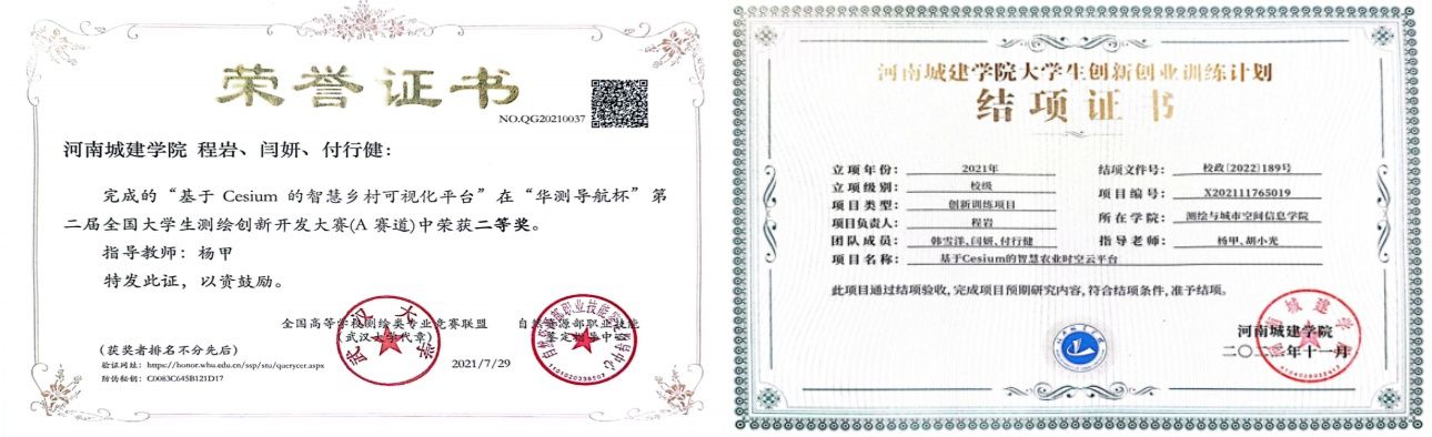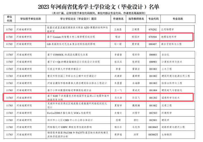 2023年河南省优秀学士学位论文评选中,公司程岩同学的《基于 Cesium 的智慧乡村三维管理系统实现》和马文浩同学的《基于SAR干涉测量技术的地面形变监测--以地震和城市地面形变为例》荣获河南省优秀学士学位论文,侯绍洋老师和孙亚飞老师荣获河南省优秀学士学位论文指导教师。