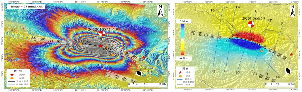 a)本实验采用Sentinel-1A升降轨数据利用D-InSAR技术进行了门源地震同震形变场监测。获取了2022年青海门源Ms6.9地震同震形变场和形变结果。