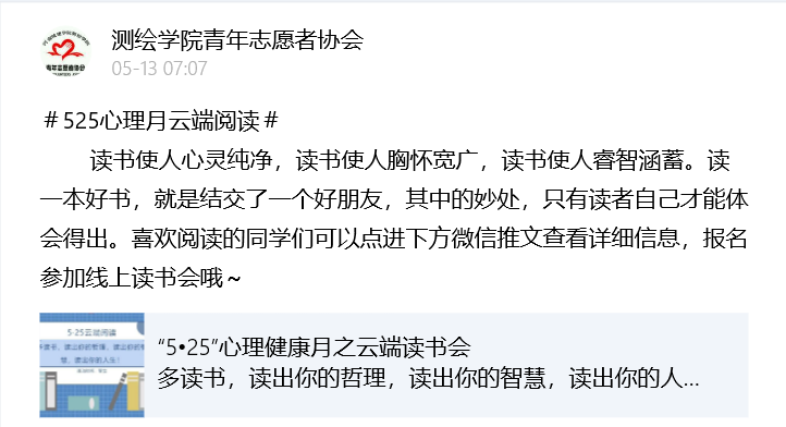 此次活动以心理健康为主题,旨在使同学们开阔视野、增长知识,培养良好的自学能力和阅读能力,提高老员工的心理素质,充分开发潜能,培养乐观向上的心理品质,促进员工人格的健全发展。同时,开展以心理健康为主题的线上阅读活动,可以使同学们通过阅读书籍来达到情感的交流、情绪的疏导等目的,化解员工的种种心理问题。这不仅对促进同学们形成健康的心理和健全的人格、获得全面和谐发展有重要意义,而且对促进公司与社会的和谐稳定,构建现代和谐校园与和谐社会,也具有十分重要的现实意义。