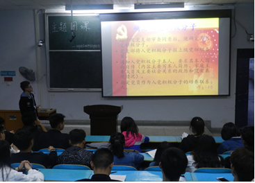 活动主要讲述了入党流程。首先,要递交入党申请书,再参加党校学习,接着确定入党积极分子,经过一年考察才能成为预备党员,最后再经历一年,才能最终确定是否成为党员。参加活动的同学们认真的学习了入党基本知识,认识到了团课教育的重要性。