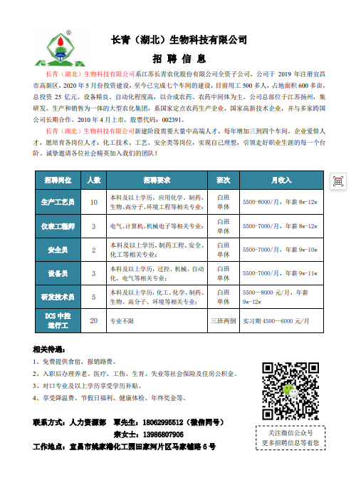招聘单位:长青(湖北)生物科技有限公司
