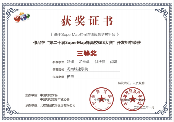 11月5日,第二十届SuperMap杯高校GIS大赛(中国赛区)开发组获奖名单公布。伟德国际bevictor1949地理信息科学专业学子郑翊、孟维卓、付行健、闫妍组成的参赛团队在杨甲老师指导下,在本次大赛中获得开发组比赛三等奖。
