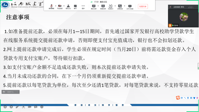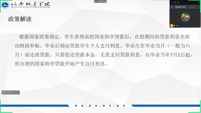 (通讯员:李 丹 王林鑫)为增强广大青年员工的诚信意识,引导青年员工讲诚信、树诚信、践诚信,树立诚信理念,营造校园诚信氛围。5月4日下午,公司召开2022届贷款毕业生线上专题宣讲会。2022届全体贷款毕业生参加了此次会议。本次会议由资助老师李丹主持。