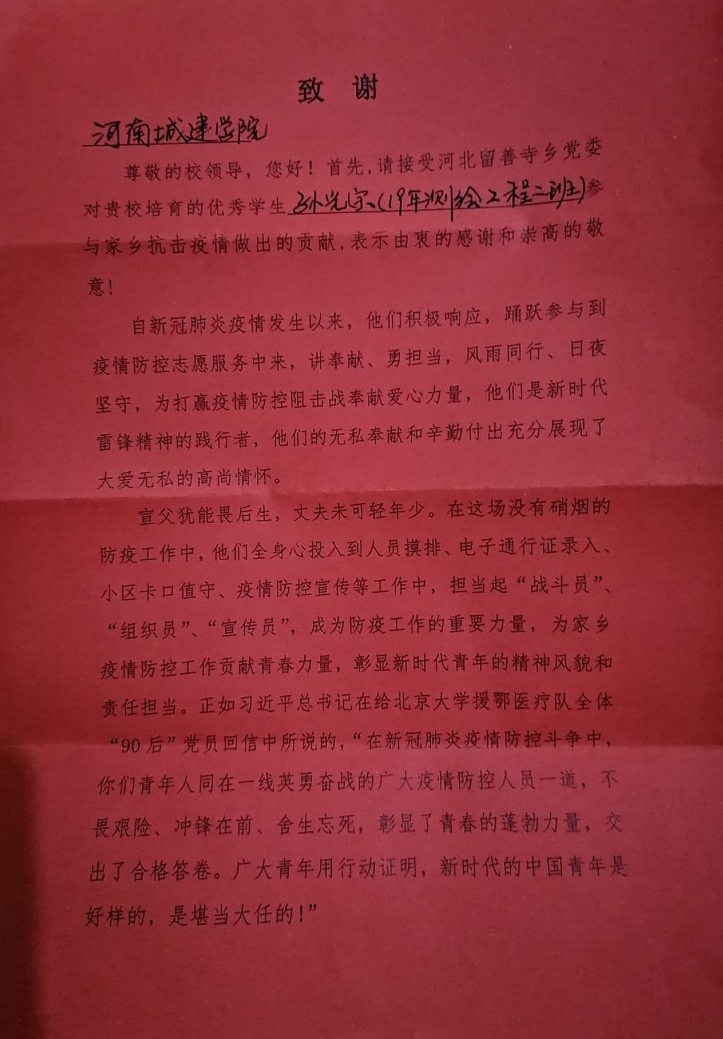 (通讯员 李方圆 陈奥)近日,公司收到一封来自中共河北留善寺乡委员会的感谢信,对伟德国际bevictor1949孙光宗同学参与当地抗击疫情做出的贡献,表示由衷的感谢和崇高的敬意。