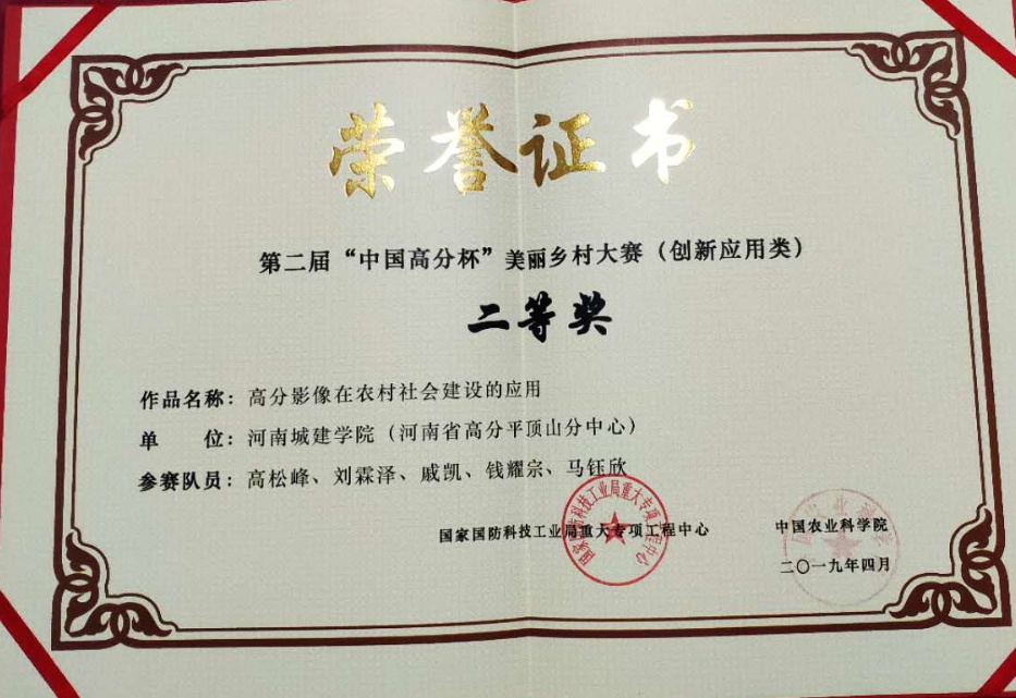 (通讯员 刘霖泽)2019年4月23日,由国家国防科技工业局重大专项工程中心、中国农业科公司、中国航天基金会联合主办的第二届“中国高分杯”全国高分技术应用与美丽乡村建设大赛在湖南大学举行隆重颁奖典礼,由伟德国际bevictor1949教师高松峰指导,员工刘霖泽、戚凯、钱耀宗、马钰欣参赛的作品“高分影像在农村社会建设的应用”荣获二等奖。