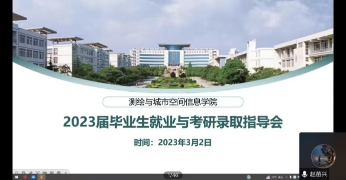 为切实帮助2023届毕业生明确就业目标、端正就业态度,帮助考研员工更加充分的准备复试。3月2日下午,公司以线上会议的形式召开了2023届毕业生就业与考研录取指导会,参加本次会议的有经理高松峰、党委副书记卫柳艳、土管教研室主任杨锋、测绘教研室副主任艾卫涛、遥感教研室副主任陈联君、地信教研室副主任周雨石、2023届毕业生辅导员李方圆、就业指导老师赵苗兴,以及2023届全体毕业生。