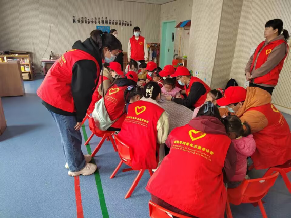 (志愿者与小朋友一起贴纸)