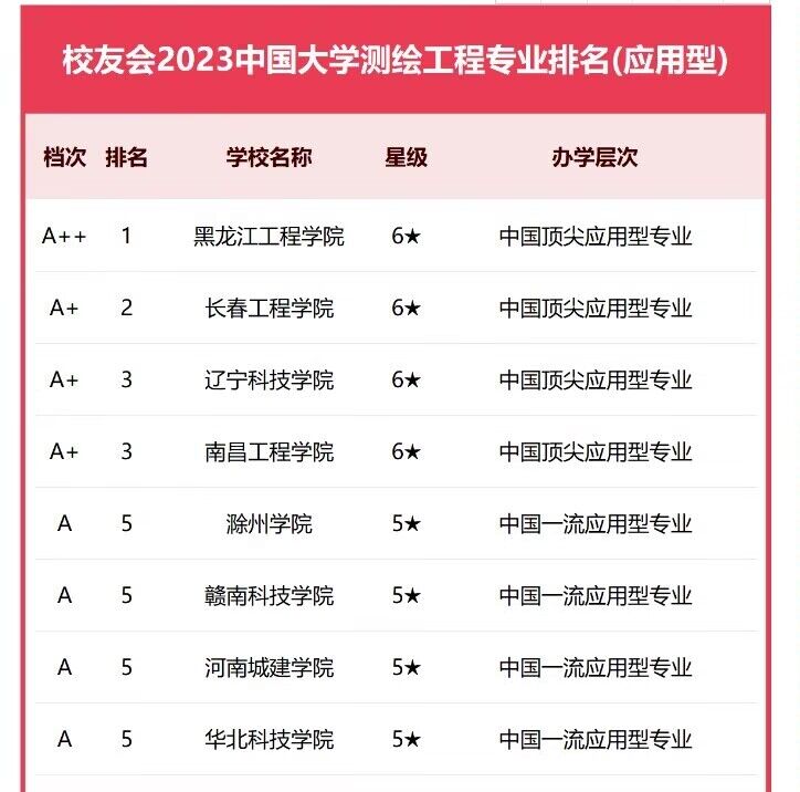 排名显示,在2023中国大学测绘工程专业排名(应用型)中,公司荣膺2023中国五星级应用型专业(5★),晋升中国一流应用型专业行列,进入A档次。