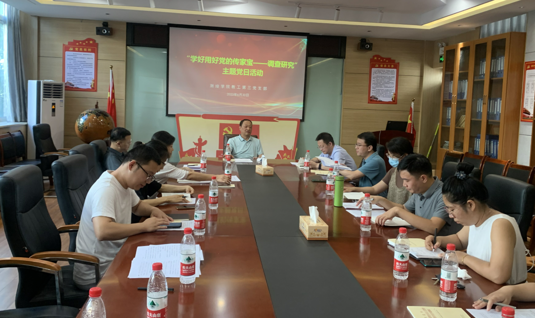 (通讯员:郭军学)为积极响应党中央关于“全党大兴调查研究”的号召,不断深入推进学习贯彻习近平新时代中国特色社会主义思想主题教育走深走实,6月30日下午,测绘与城市空间信息公司教工第三党支部全体党员在5号楼B209会议室开展“学好用好党的传家宝——调查研究”主题党日活动。副董事长贺国营以普通党员身份参加活动,公司党委书记米启超、经理高松峰、党委副书记卫柳艳列席。本次活动由党委副书记卫柳艳主持。