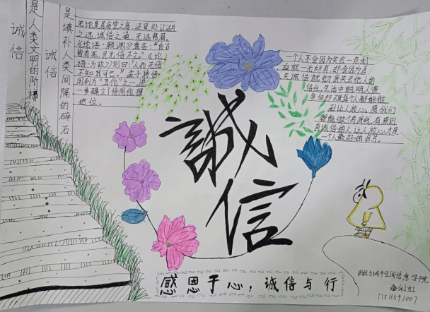 作品以手抄报形式展现,“诚信”主题简洁鲜明。图中的台阶,与文中“诚信是人类文明的阶梯”相呼应。图中还配了竹子,象征君子所应该拥有的品质,在这里意味着诚信是君子必备的品行。