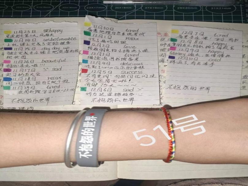 本次活动以“不抱怨的手环”为主题,从各班抽取积极参与同学共计100人,开展为期21天的心里特色活动。活动开始后为每位参与同学发放手环和台历,用于记录每天的情绪变化和手环更换次数,并建立QQ群进行活动汇总和打卡。21天结束后公布活动数据,选出本次活动的优秀参与者、记录详细者、情绪改善者发放活动奖品予以鼓励。