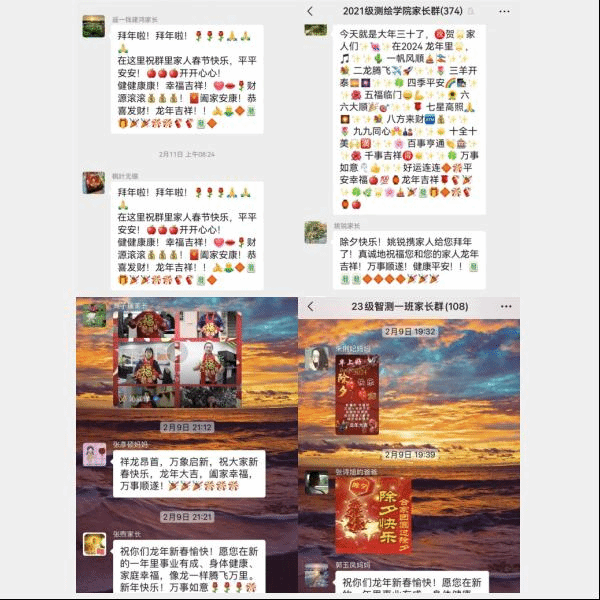 为了更好地开展活动,达到家校协同育人的效果,测绘公司学工团队提前精心策划制作跨年夜拜年视频,于2024年2月9日除夕夜,通过公司推文和云视频的方式为全体员工家庭送上新年祝福。全体辅导员将推文和视频发送至各班级家长群、员工群,诚邀家长们、员工们参加新年互送祝福活动。活动受到了家长们、员工们的一致喜爱,各位家长和员工纷纷送上真挚的新年祝福,促进了家校联系,增进了家校纽带,增强了家校共育。