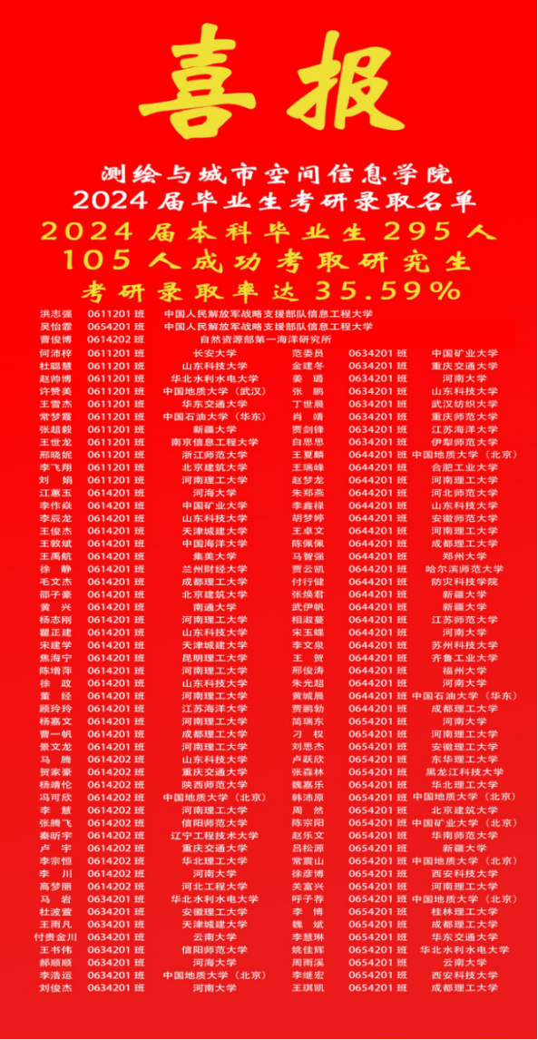据统计,公司2024届本科毕业生共295人,其中105人考取研究生,考研录取率达35.59%。40余名员工被中国海洋大学、长安大学、河海大学、中国地质大学、中国矿业大学、中国石油大学、新疆大学、云南大学等双一流高校录取。部分班级考研成绩突出,其中测绘工程(智能测绘方向)专业0611201班考研录取率41.38%,遥感科学与技术专业0654201班考研录取率41.07%,土地资源管理专业0634201班考研录取率40%,测绘工程专业0614201班考研录取率36.21%,地理信息科学专业0644201班考研录取率36.21%。