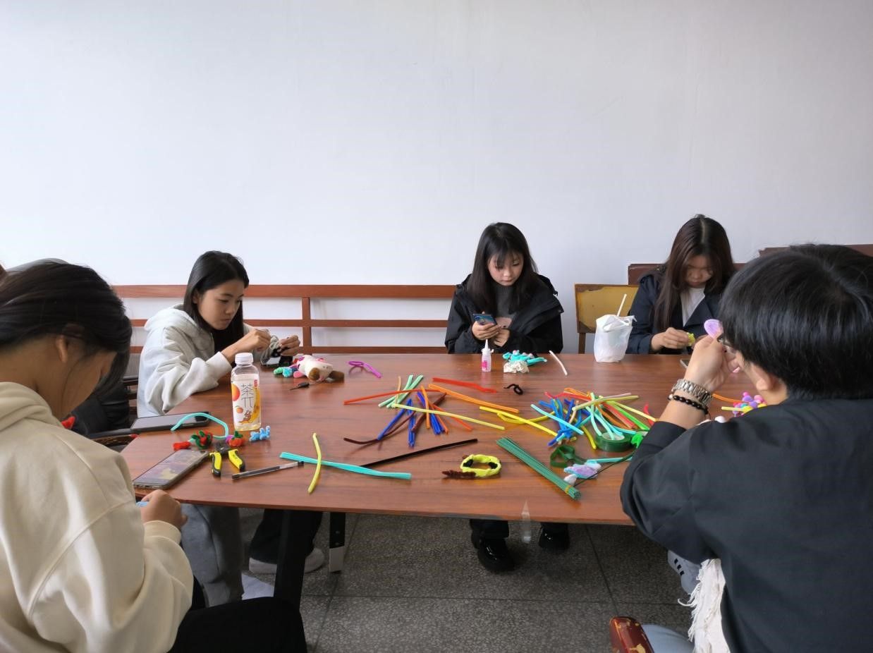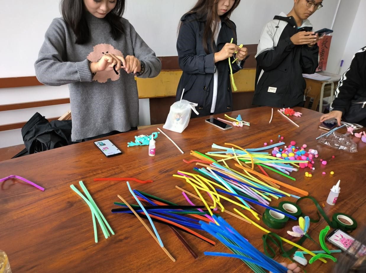 活动前期工作人员在活动地点提前准备好需要的材料。活动自由创作期间,参与者根据教程和自己的想象,通过“沉浸式”手工体验,将扭扭棒制作成各种符合自己心目中想象的作品。“可爱的小花、展翅欲飞的蝴蝶,小巧精致的挂件”,一个个精致的作品充满了新意,表现出灵巧。整个活动过程不仅让参与者们在创作中沉下心来,摒除自身的负面情绪,还让参与者在作品完成后产生强烈的自豪感。作品分享环节,参与者们在一片欢笑声中互相分享着亲手制作的作品。