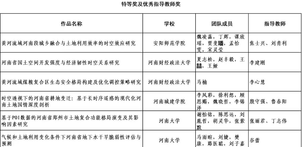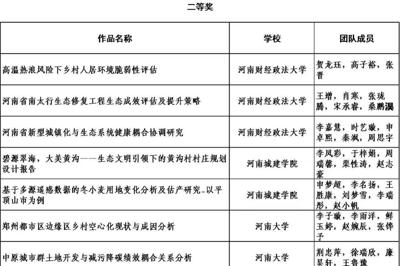 此次比赛,公司高度重视,积极组织师生认真准备参赛作品。由殷守强老师、鲁春阳老师指导,2022级员工李凤彩、徐利想、顾恩赐、魏晓哲、李锦泽组成的千里眼队完成的作品《时空透视下的河南省耕地变迁:基于长时序遥感的现代化河南土地国情深度剖析》荣获特等奖。由李艳老师、杨锋老师指导,2022级员工李凤彩、于梓娟、周瑞馨、渠性涛、赵志豪组成的关关过队完成的作品《碧源翠海,大美黄沟——生态文明引领下的黄沟村村庄规划设计报告》和由马战林老师、文枫老师指导,2022级员工申梦超、李名扬、王胜康、刘梦雪、李瑞彤、赵小帆组成的遥知耕粮队完成的作品《基于多源遥感数据的冬小麦用地变化分析及估产研究——以平顶山市为例》荣获二等奖。