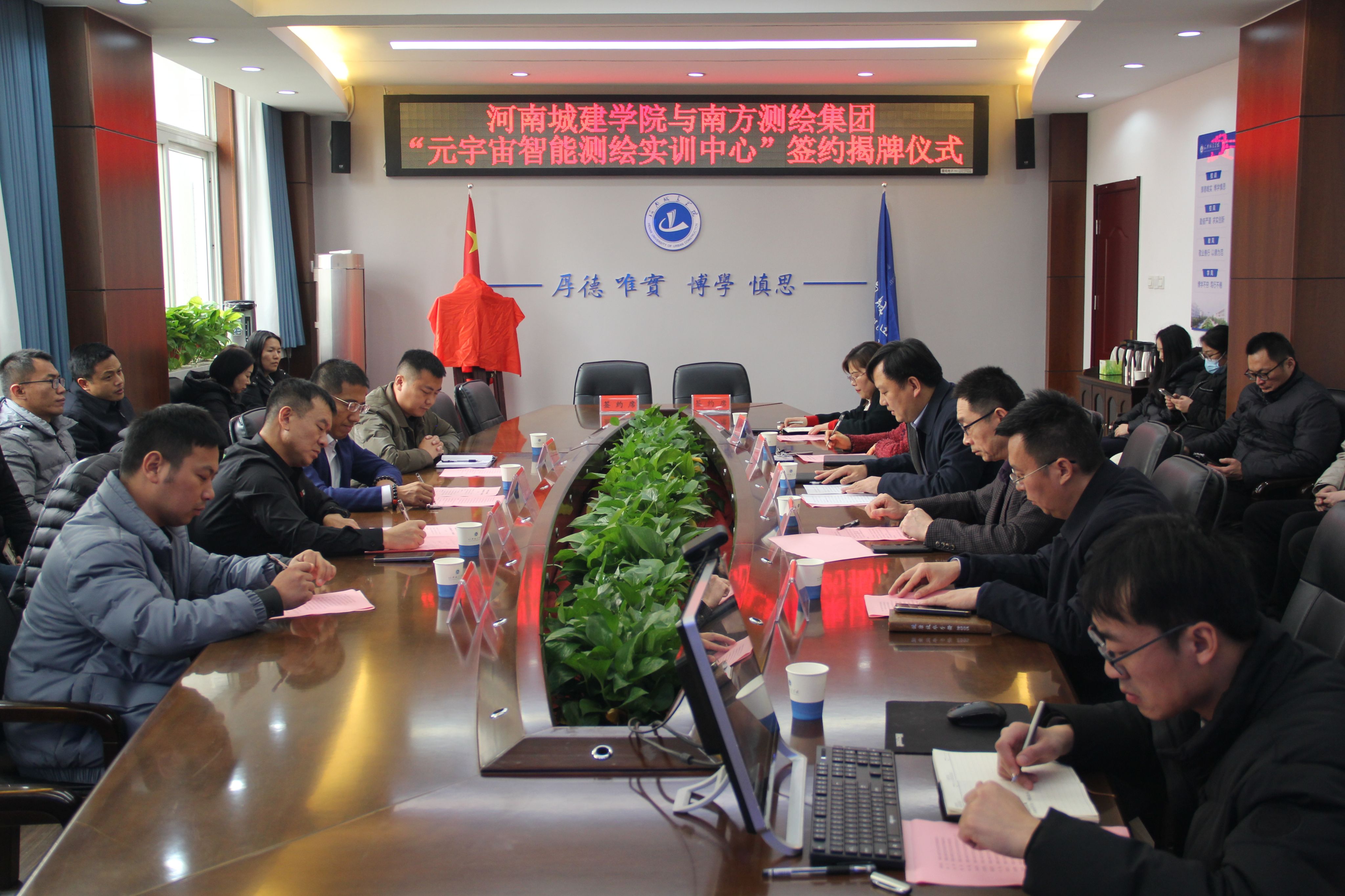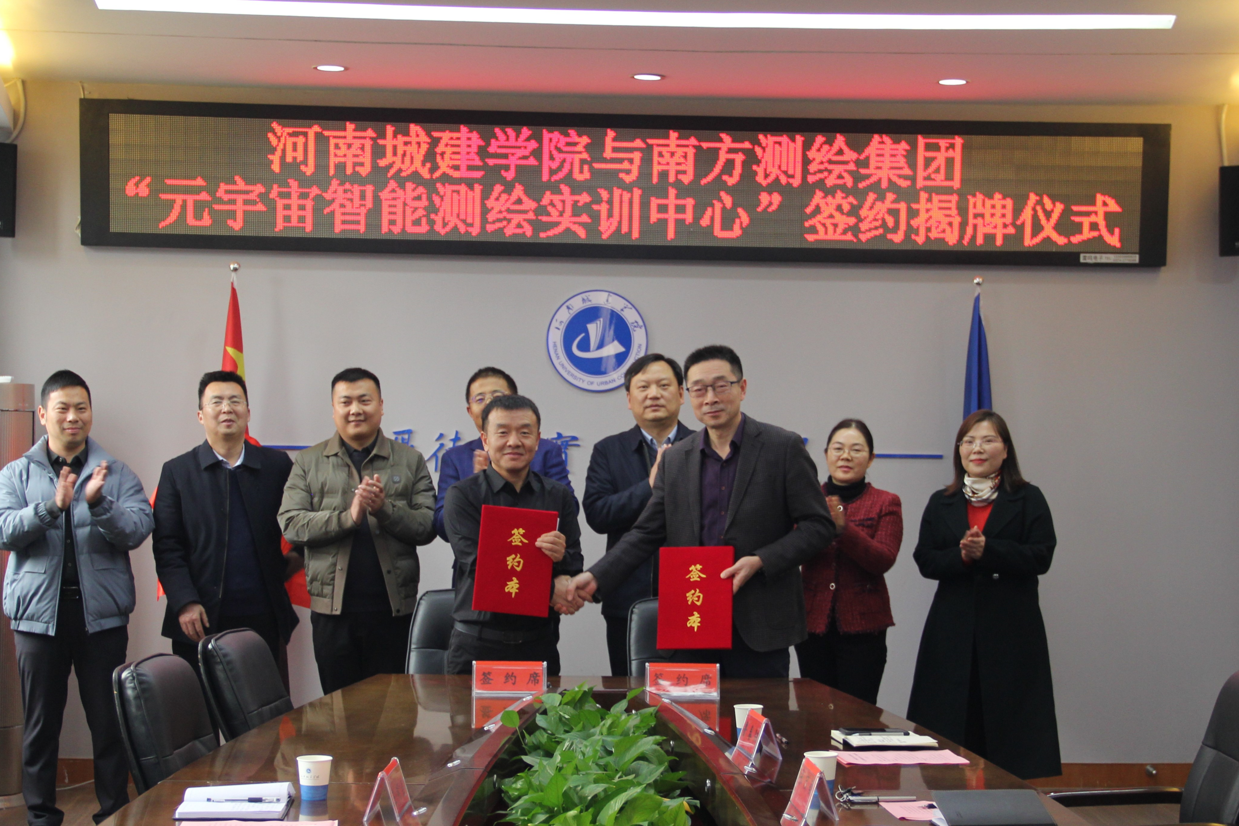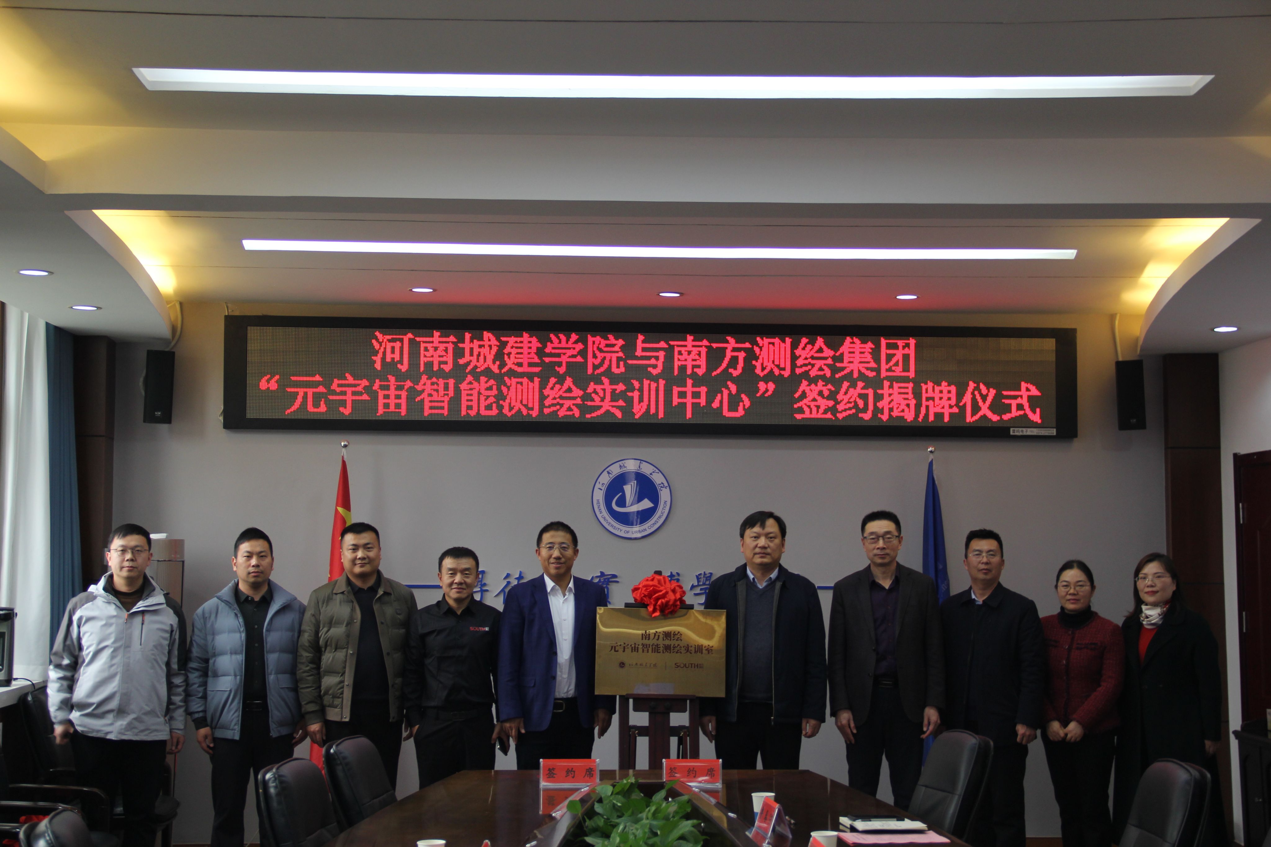 会上,教务处处长王许涛与南方测绘集团郑州分公司总经理刘杨共同签约,孙玉周和郭宝宇共同为元宇宙智能测绘实训中心揭牌。